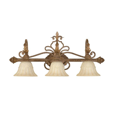 Traditionally styled 3 Light Vanity Fixture with Rust Scavo glass.