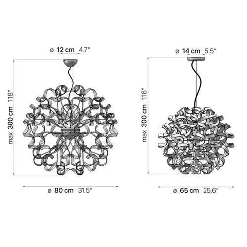 The Astro 65/80 Chandelier made in Italy has been designed by Studio Tecnico Metal Lux & SSD. The imagination and the fantasy of Venetian style are interpreted by a graceful free-form ribbon. Flexible metal arms allow an ever-changing and sophisticated approach that allows endless variations of shapes, sizes, and colors. Constructed of metal and glass, mounts directly to a standard junction box, cable length max 10’ (field adjustable).