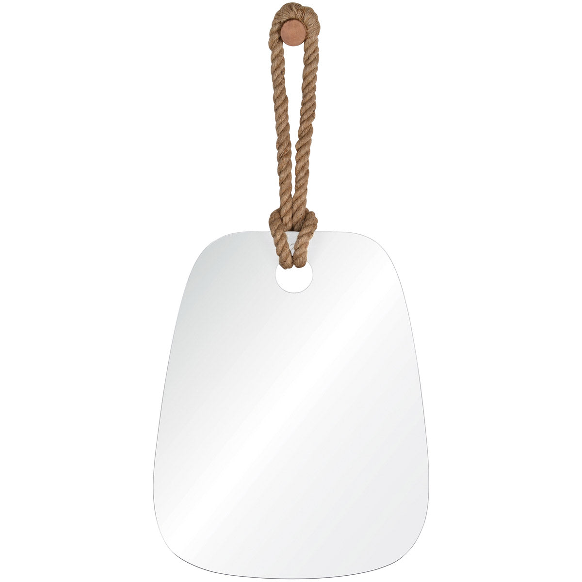 Suspended from a wooden peg by twisted hemp rope, the eclectic design of this wall mirror is the perfect combination of fun and functional. The curved, freeform shape and small scale of the mirror lends itself to unique placement throughout the home - perfect in a powder room for applying makeup or in a master bath, checking a close shave.