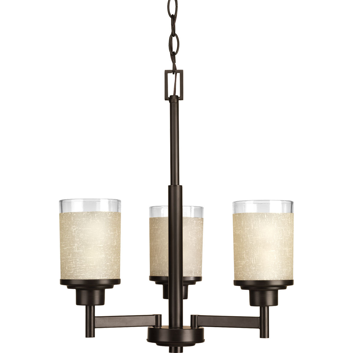 Three-light chandelier features a pleasingly simple Antique Bronze frame while visually interesting textured etched umber linen glass are complemented by a crisp clear edge accent. Create the sophisticated feel of modern, urban living in your home - no matter where you live.